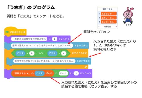 「うさぎ」のスプライトで、緑の旗が押された時に、「(番号で答えてね!1.コロッケ 2.カレーライス 3.ソフトめん)ときいてまつ」を実行し、答えの入力を待ちます。