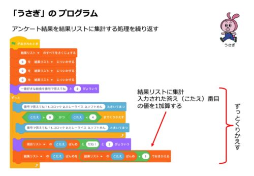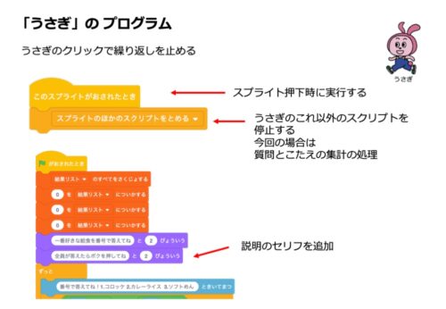 複数人へのアンケートなので、終了する機能が必要です。今回は、アンケートを繰り返す「うさぎ」のスプライトに、スクリプトを停止する機能を追加します「このスプライトがおされたとき」を利用し、その中に「スクリプトのほかのスプライトをとめる」ブロックを入れます。これにより、アンケートの繰り返し処理を停止させます。
