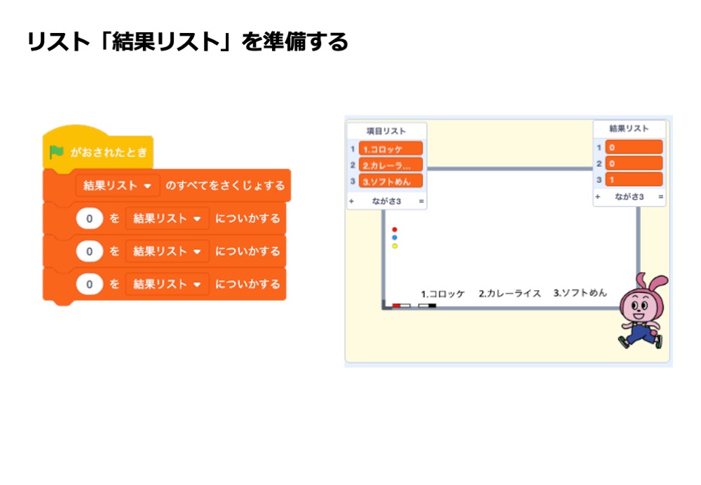 「結果リスト」の1番目には「コロッケ」の得票数、2番目には「カレーライス」、3番目には「ソフトめん」の得票数を集計します。
