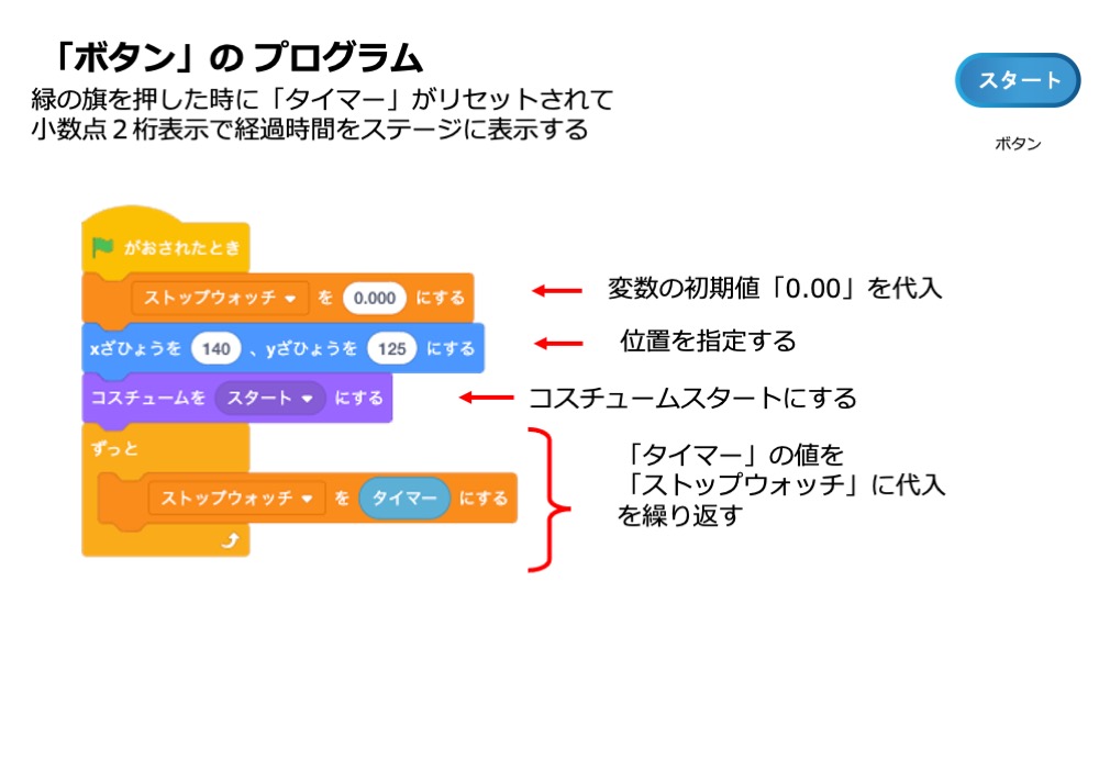 前回のデジタル時計にストップウォッチ用の「ボタン」のスプライトと変数「ストップウォッチ」を表示します。「ボタン」のコスチュームは「スタート」と「ストップ」の2種類で押すたびに表示を変えます。