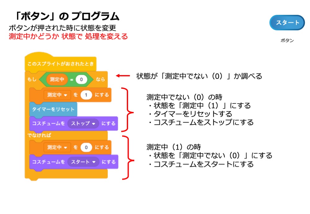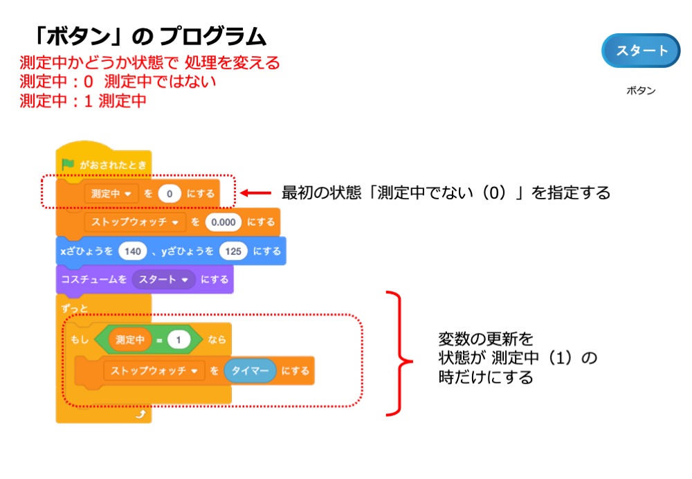 そこで変数「測定中」を用意して以下のようにその値で状態管理をしていきます。