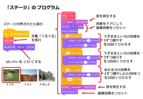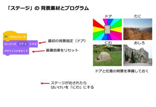 • 初期設定: 緑の旗が押されたら、必ず最初の「ドア」画面に戻り、画像効果をリセットするように設定しておきます。