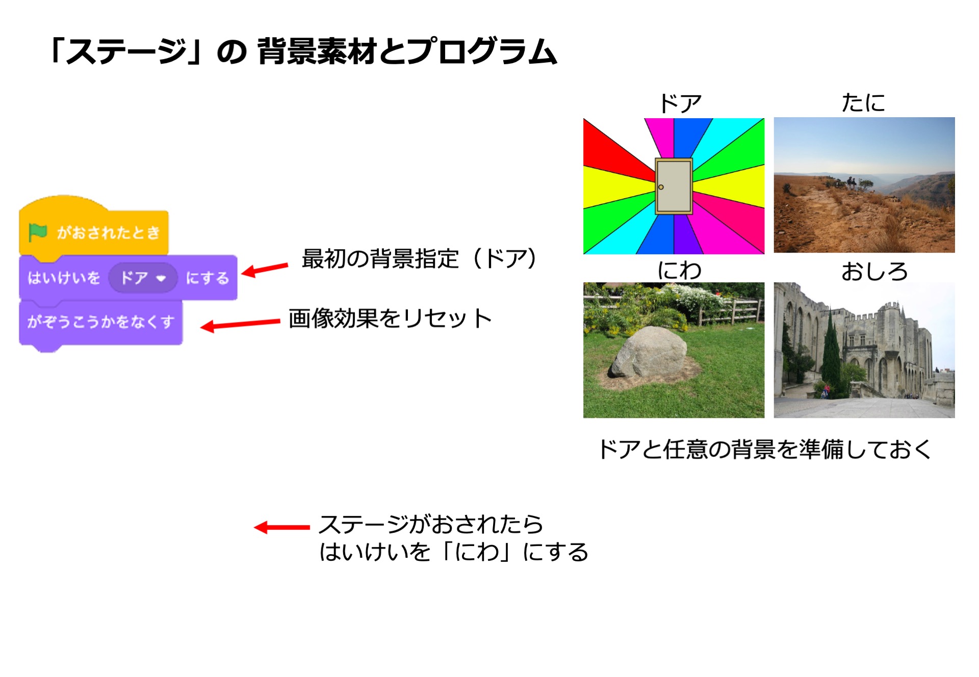 まずはステージの背景として「ドア」、ワープ先の背景(「にわ」「たに」「おしろ」など)をいくつか用意します。
