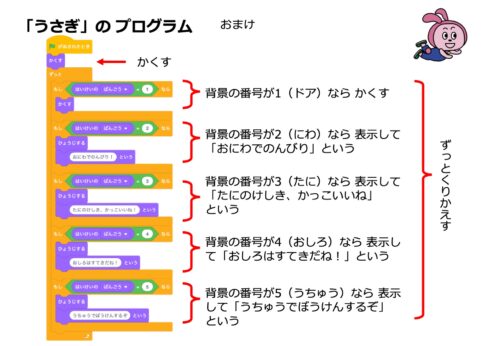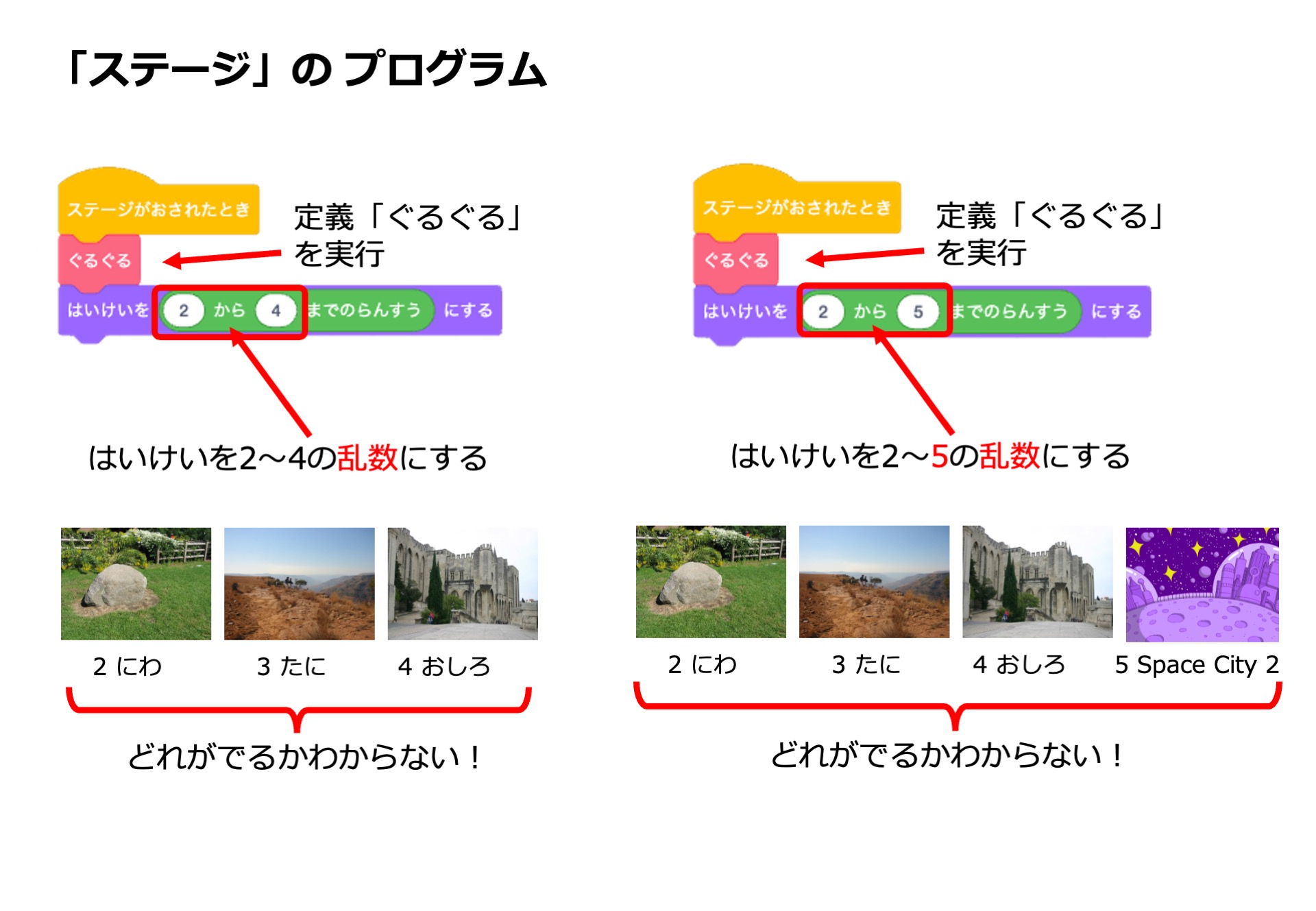 • ポイント: 背景を増やしたときは、その範囲に合わせて乱数の数字を書き換えます。この「数字を試行錯誤する」繰り返しが、乱数の自然な理解を促進します。
