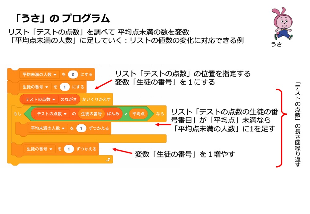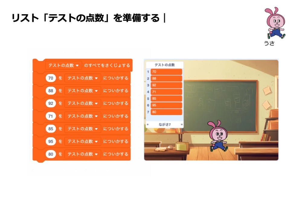 Scratchの「リスト」機能を使って、データを条件で絞り込んで数えるプログラムに挑戦します。今回は、テストの点数をリストに格納し、平均点未満の人数を求めます。