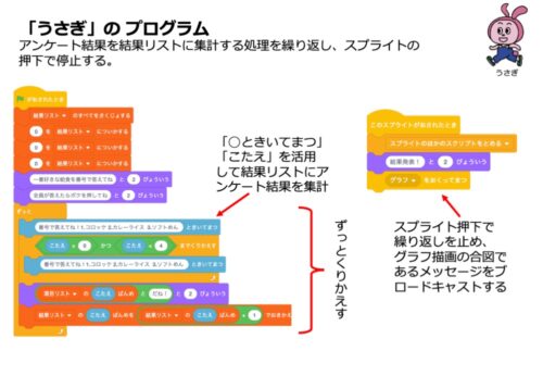 「うさぎ」のスプライトで、給食の好きなメニューのアンケートをとり、メニューごとの得票数を「結果リスト」に集計します。「うさぎ」のスプライトが押されたら、アンケートをとる処理を停止し、グラフ描画の合図としてメッセージ「グラフ」をブロードキャストします。