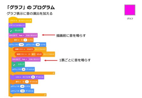 まずはグラフ描画の前と描画中に「おわるまで○のおとをならす」ブロックで楽しい音の演出を加えます。