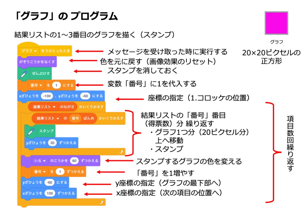 「グラフ」のスプライトは、メッセージを受け取ったら、項目ごとに得票数分のスタンプを縦に積み上げて棒グラフを表示します。