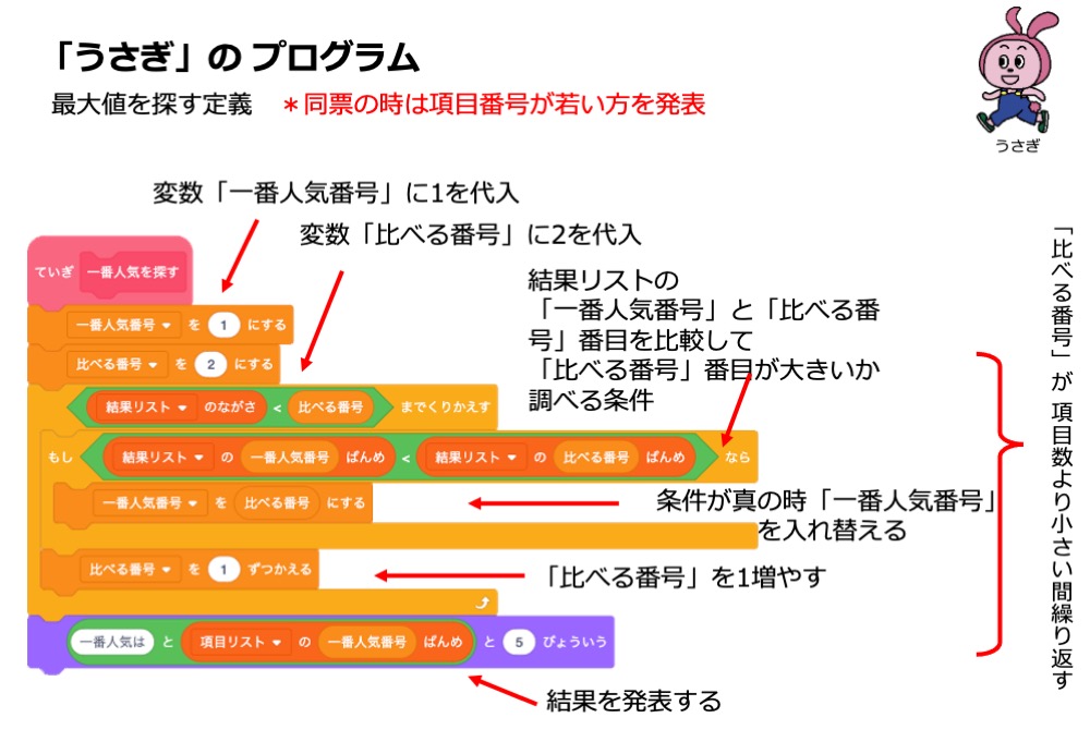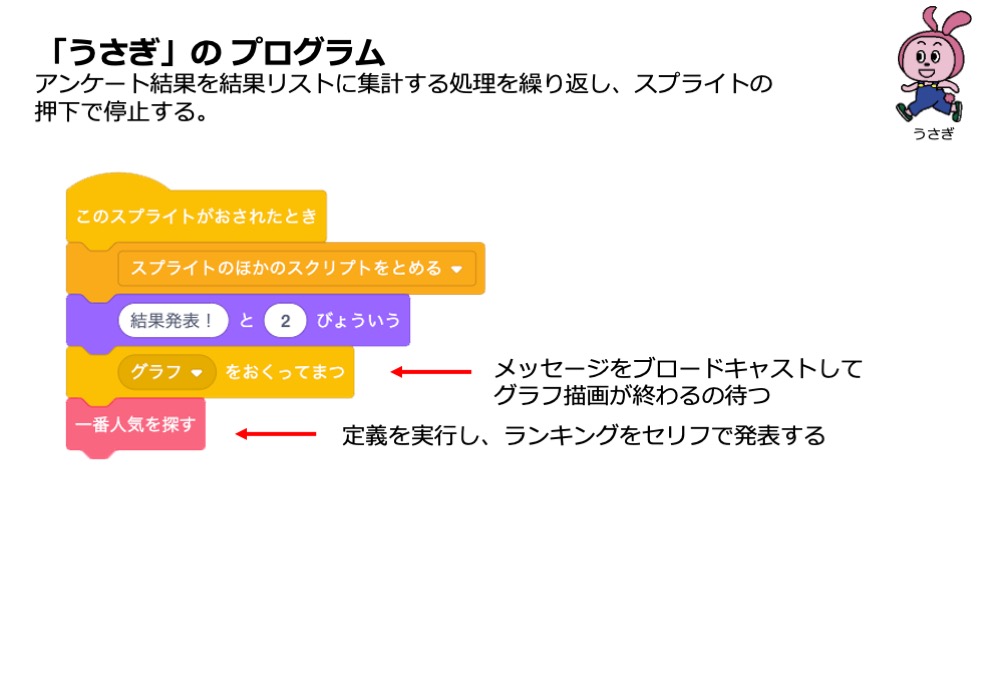 「うさぎ」のスプライトで、給食の好きなメニューのアンケートをとり、メニューごとの得票数を「結果リスト」に集計します。「うさぎ」のスプライトが押されたら、アンケートをとる処理を停止し、グラフ描画の合図としてメッセージ「グラフ」をブロードキャストします。