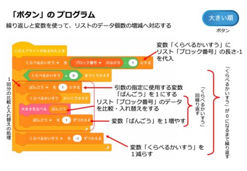 ユーバーの「Scratchで小・中学校のプログラミング」Vol.21 <スクラッチで大きい順に並べかえ②(繰り返しで自動化)>