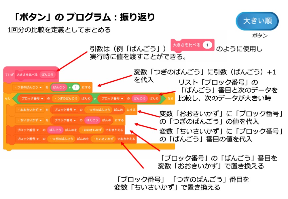 Scratchの「ブロックを作る」機能で「引数」付きのブロック「おおきい(ばんごう:引数)」を前回用意しました。引数とは実行時に指定値を渡すための仕組みです。