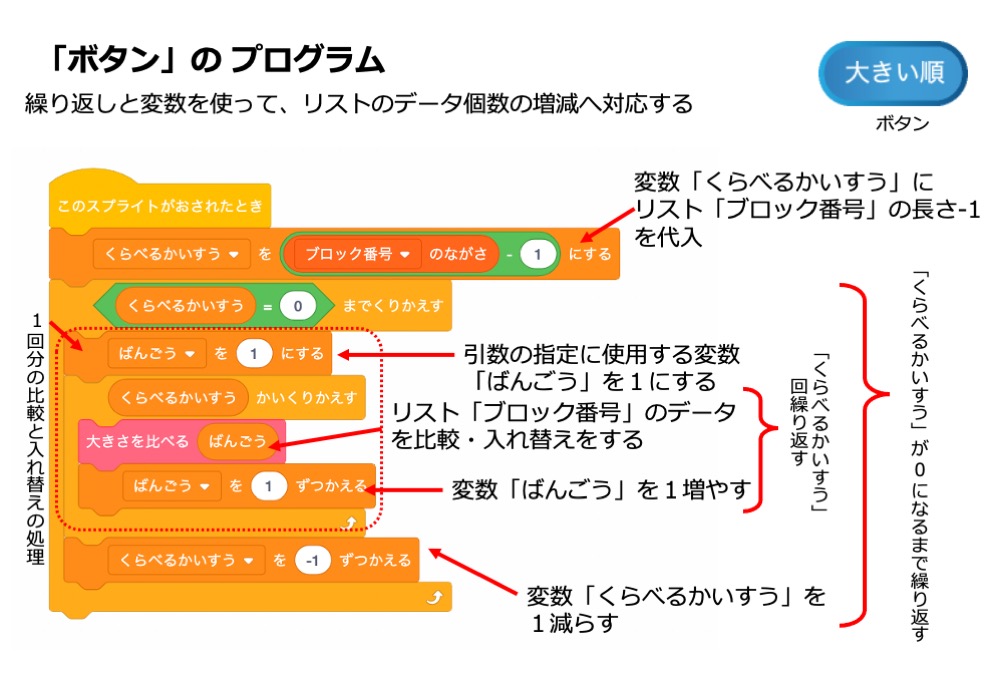 変数「くらべるかいすう」が0になるまで、「くらべるかいすう」を減らしながらこうして繰り返し完成します。