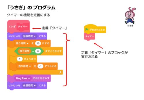 「ブロック定義」の「ブロックをつくる」ボタンを押して定義「タイマー」を作ります。