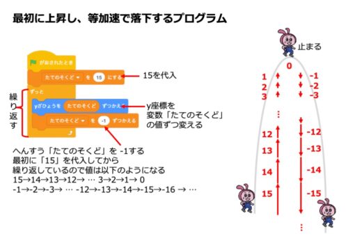 最初に変数「たてのそくど」に15を代入してみます。これにより、最初は速く上昇し、次第に減速していきます。やがて「たてのそくど」が0になると、キャラクターは一旦停止してから、等加速で落下します。こうして自然なジャンプの動きを再現します。