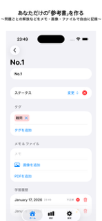 問題ごとに、テキストメモ、画像、PDF ファイルを紐付け、解放などを記録することができます。かさばる演習ノートやファイルではなく、スマホアプリでどこでも「⾃分だけの解説書」を閲覧でき、質の⾼い復習が可能になります。
