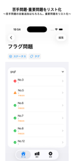 ⽇々の学習の中で、「要注意」や「不正解」のステータスが3回以上累積した問題は、苦⼿問題として⾃動的に「フラグ問題リスト」へと分類されます。 試験直前期、「何から⼿を付ければいいかわからない」という状況でも、このリストを開けば⾃分専⽤の「弱点克服ドリル」が完成しています。⼿動でリストを作る⼿間は⼀切かかりません。(もちろん⼿動で追加も可能です)
