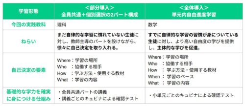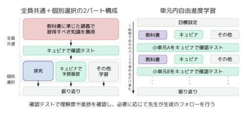 部分導入の授業モデル(理科)では知識の獲得を全員共通で行う前半の講義パートと一人ひとりが自己決定学習を行う後半の個別選択パートの2部構成で、全体導入の授業モデル(数学)では、指定の単元について教材や学習のペースなどの学び方を生徒自身が決める単元内自由進度学習で授業を構成した。