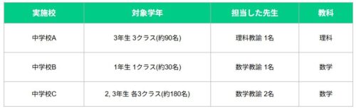 実証は渋谷区立の3つの中学校(中学校A・B・Cとする)の教員4名、生徒約300名(中学1~3年)を対象に、2024年6月~2025年3月の期間、理科と数学の授業で実施された。
