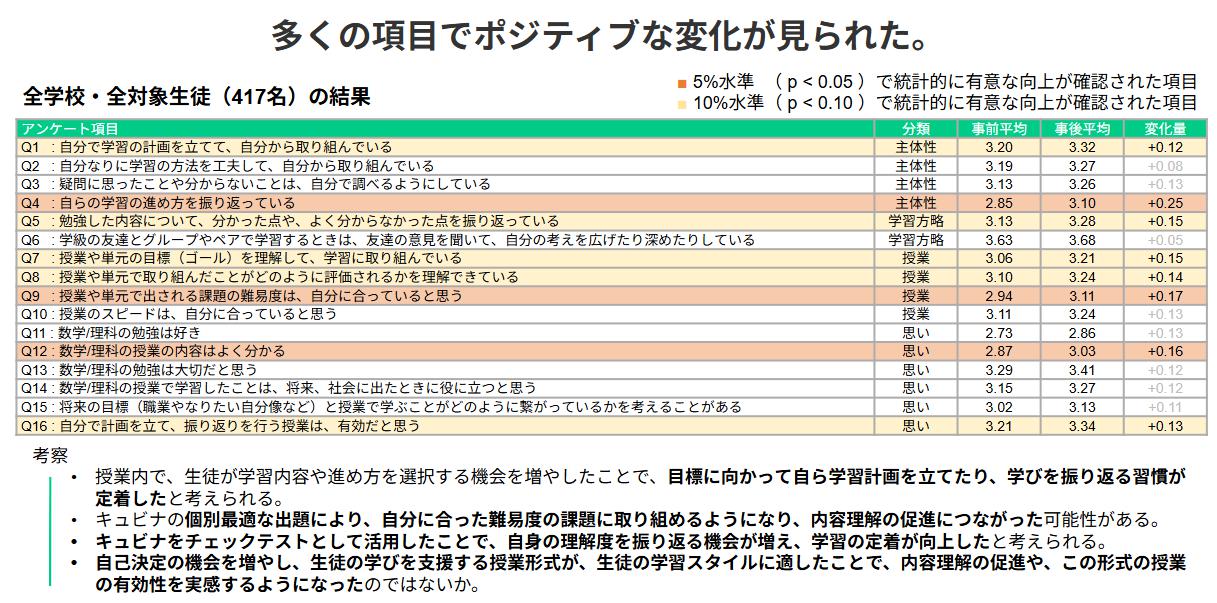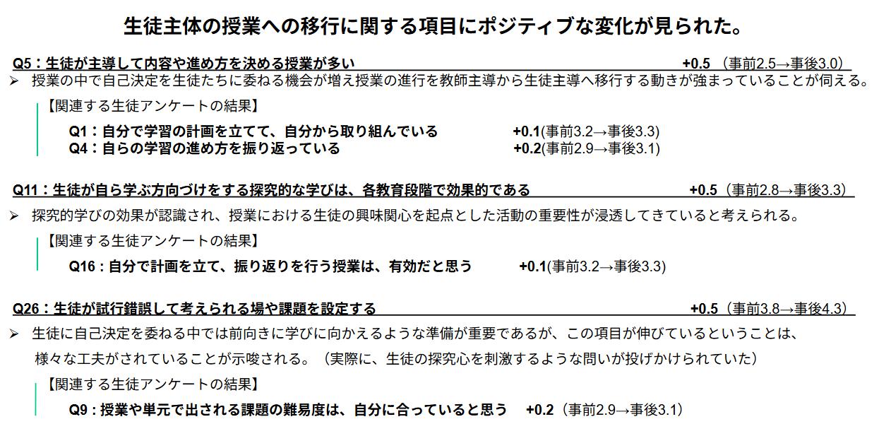 などの項目で統計的に優位な向上が見られ、生徒主体の授業への移行に関するポジティブな意識の変化を確認することができた。