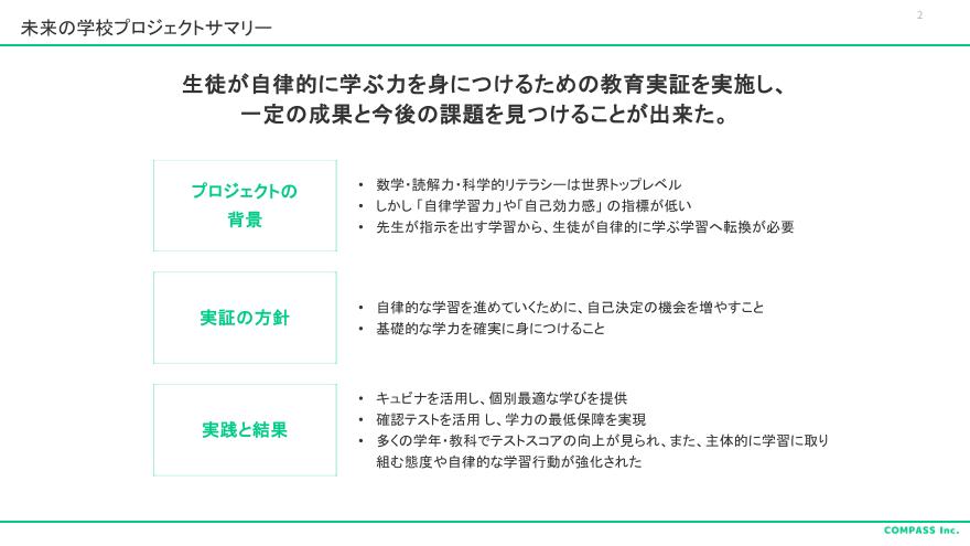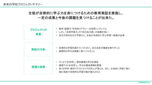 渋谷区とCOMPASSが共同で進める「未来の学校プロジェクト」は、渋谷区が目指す未来の学校における「自律した学習者を育む環境」としての授業モデル構築の取り組みだ。昨年度はモデル実証校における検証が行われた。