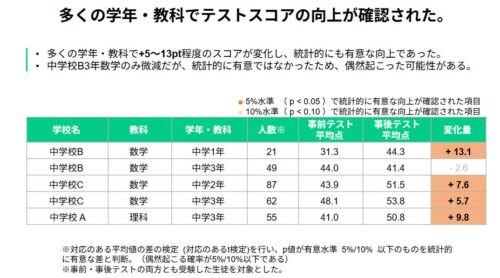 もう一つの方針である学力の保証の観点では、事前・事後テストにおける学力の向上を確認することができた。中学校Bの1年生の数学では事前テストの平均点が31.3点だったところ、事後テストでは44.3点に向上したほか、多くの学年・教科で+5〜13pt程度のスコアが変化し、統計的にも有意な向上が確認できた。