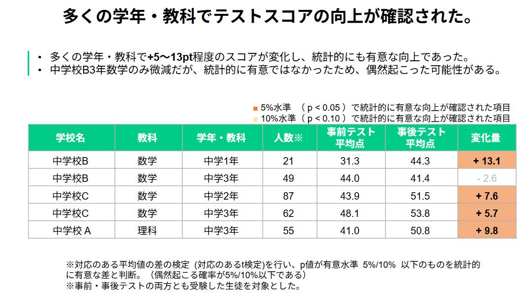 ■学力の向上: 多くの学年・教科でテストスコアの向上が確認された。