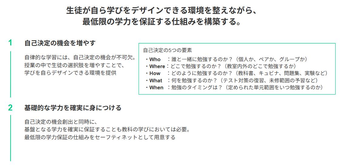②については、①による従来の学びの形からの転換を図りながらも、キュビナの活用により基礎的な学力を確実に身につけるための仕組みを授業内に組み込む。