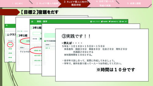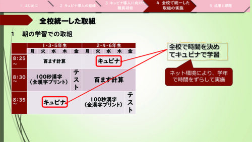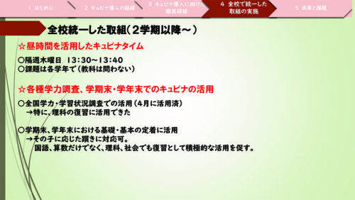 2点目は「キュビナ」の活用に対し、全校で統一した取り組みを実施したことで、確実に「キュビナ」を活用する場が確保できました。