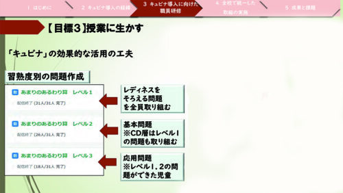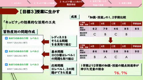 1点目は「キュビナ」活用に向けての校内研修を段階に分けて行ったことで、どの教員も「キュビナ」の操作ができるようになり、子どもたちの活用率につながりました。