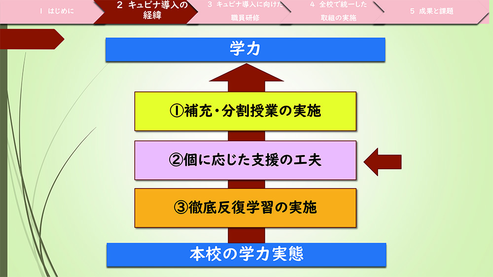 学力実態を踏まえ、学力の向上を図るために、補習・分割授業、徹底反復学習などに取り組むことにしました。なかでも「個に応じた支援」を充実させるため、AI型教材「キュビナ」を導入しました。