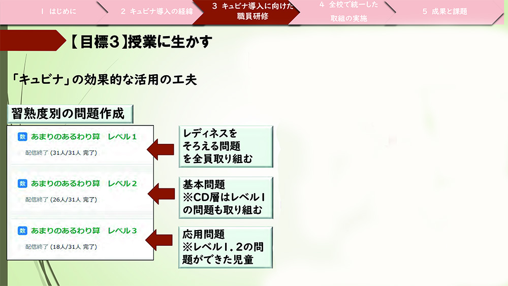 またレベル3には応用問題を取り入れ、レベル1、2の内容を理解した児童に取り組ませました。ただし、レベル1、2ともに間違いがほぼないことが重要であることを周知徹底しました。