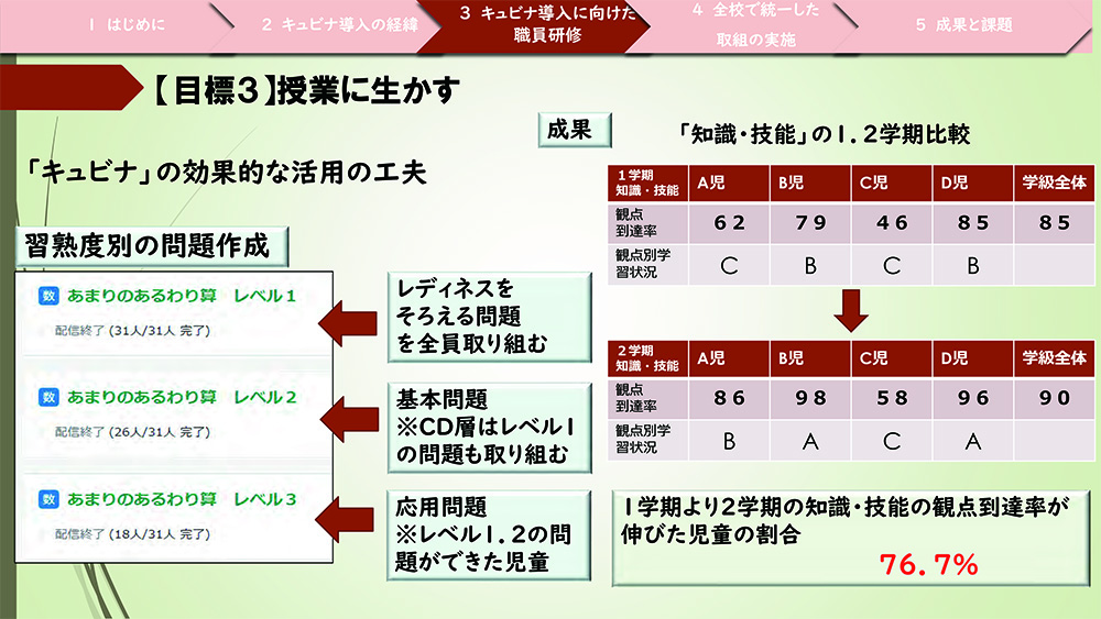 1点目は「キュビナ」活用に向けての校内研修を段階に分けて行ったことで、どの教員も「キュビナ」の操作ができるようになり、子どもたちの活用率につながりました。