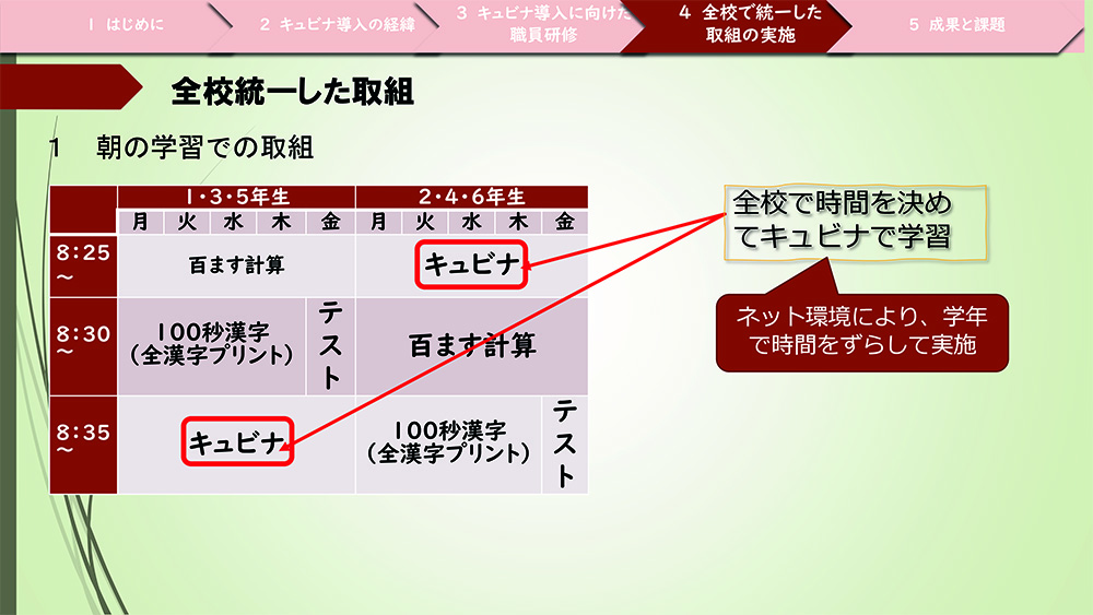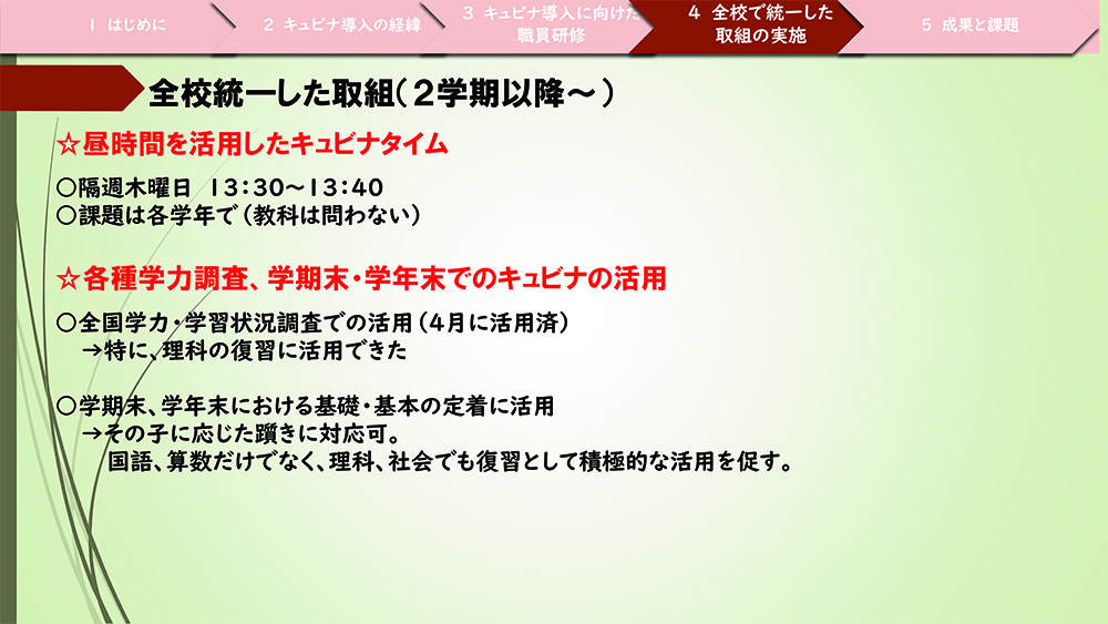 2点目は「キュビナ」の活用に対し、全校で統一した取り組みを実施したことで、確実に「キュビナ」を活用する場が確保できました。