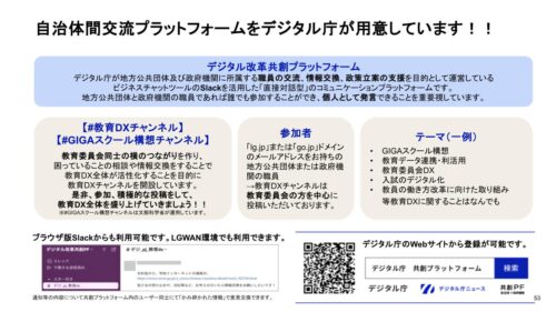「これまでの『地方自治だから地方自治体にお任せ』というスタンスではなく、自治体の皆さんが調達の際にいかに楽にできる状態を作っていくのか、そのための情報提供が必要だと考えています。」と言い、ピッチイベントの開催や「教育DXサービスマップ」や「モデル仕様書」のような調達時に役立つ情報集約のほか、自治体担当者であれば誰でも参加できるSlackチャンネル「デジタル改革共創プラットフォーム」を紹介した。