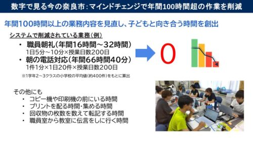 奈良市では、まず人の面におけるすべての教職員がクラウドベースで業務を進めるようになる、という目標に対し、校務のシステム基盤をクラウド、かつ子どもたちと同じGoogle基盤とすることで教職員の業務をクラウドの世界で行いやすくするという、逆説的なアプローチを取ったという。そうして必然的に「クラウドの世界で業務をする」状況を作ったことで教職員の意識が変わり、クラウド前提で「共有すればいい」「一緒にやればいい」というように業務のやり方そのものが変わっていったという。