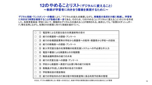 こうした効果創出を全国に広げていくための省庁の取り組みとして、久芳氏は教育DXロードマップの「12のやめることリスト」について紹介した。一足飛びでDXを実現することは難しいという実感のもと、まずは「慣れる」段階が必要という観点から作成したものだという。「「やめましょう」とか、「こうやったら効率化できますよ」ではなくて、「あ、これってデジタルに置き換わっても一緒だよね。だけど時間は減ったね」と。このあたりから慣れをまず入れていただいて、そしてその慣れたところから横展開を図っていくという流れを作っていけるようにと感じています。」と久芳氏は語った。