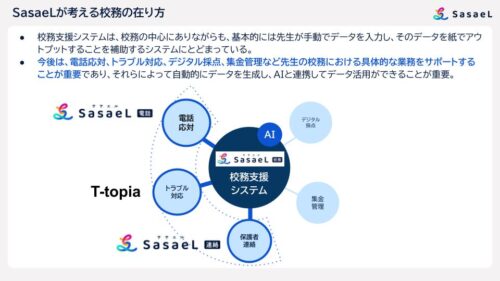 システムの観点では、「今後、学校ごとに授業時数やカリキュラムなど柔軟にやっていいとなったときに、校務支援システム側でも学校によって機能や設定方法などを変えられるようにしないと、先生の痒いところに手が届くというのが難しくなってくる。」と既存の校務支援システムの柔軟性に課題感を感じているとして、柔軟なカスタマイズを開発方針としているSasaeLへの期待感も伝えられた。