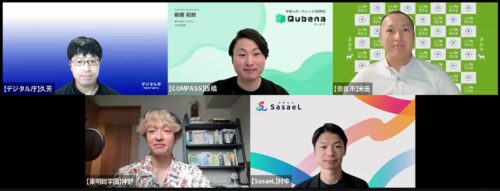 登壇者は、デジタル庁国民向けサービスグループ 久芳全晴企画官、奈良市教育委員会事務局 教育DX推進課 米田力教育ICT推進係長、学校法人東明館学園 理事長・校長でCOMPASSファウンダーの神野元基氏、SasaeL 村中順紀代表取締役社長。モデレーターはCOMPASS 未来教育室の板橋和政氏が務めた。