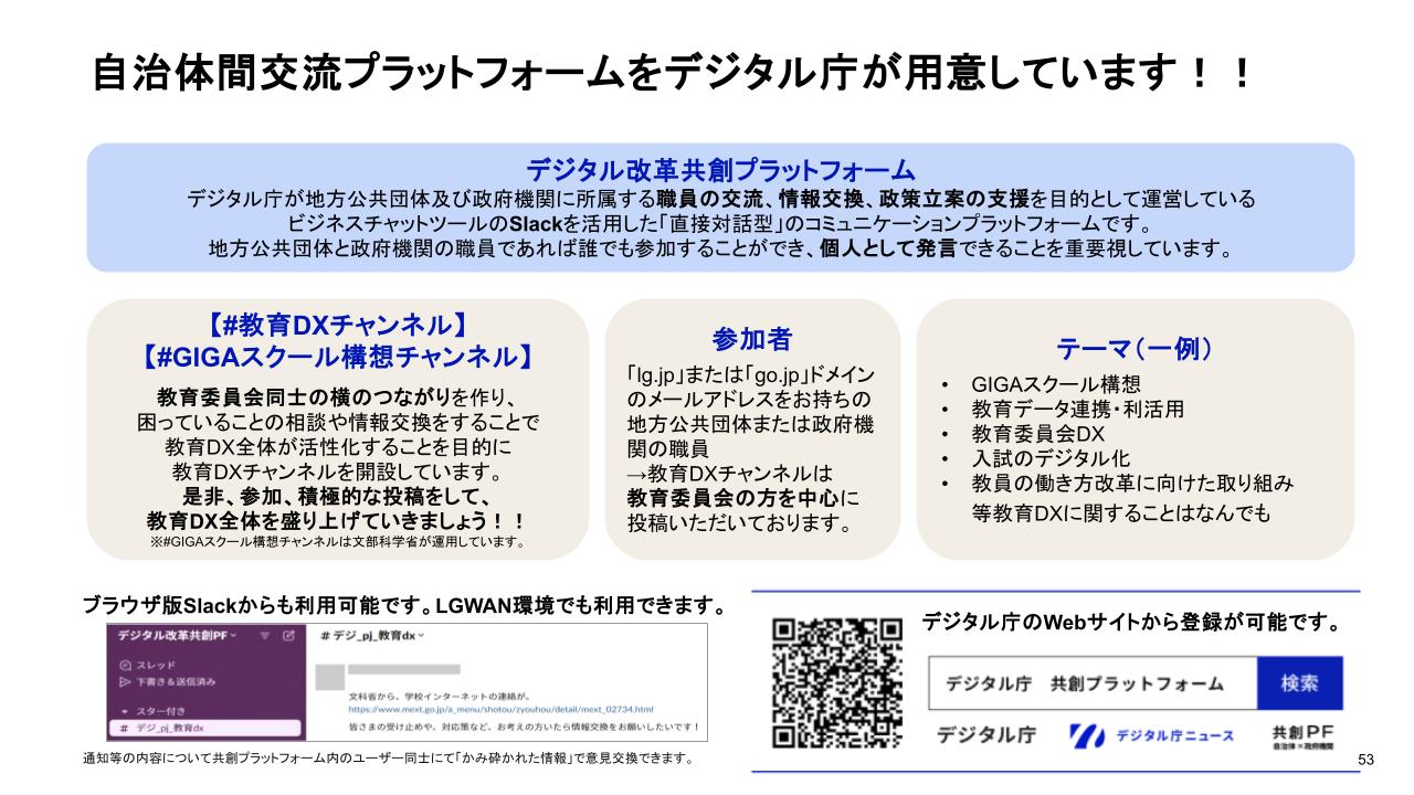 「これまでの『地方自治だから地方自治体にお任せ』というスタンスではなく、自治体の皆さんが調達の際にいかに楽にできる状態を作っていくのか、そのための情報提供が必要だと考えています。」と言い、ピッチイベントの開催や「教育DXサービスマップ」や「モデル仕様書」のような調達時に役立つ情報集約のほか、自治体担当者であれば誰でも参加できるSlackチャンネル「デジタル改革共創プラットフォーム」を紹介した。