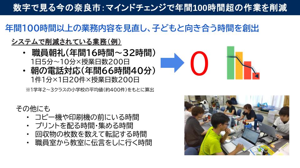 奈良市では、まず人の面におけるすべての教職員がクラウドベースで業務を進めるようになる、という目標に対し、校務のシステム基盤をクラウド、かつ子どもたちと同じGoogle基盤とすることで教職員の業務をクラウドの世界で行いやすくするという、逆説的なアプローチを取ったという。そうして必然的に「クラウドの世界で業務をする」状況を作ったことで教職員の意識が変わり、クラウド前提で「共有すればいい」「一緒にやればいい」というように業務のやり方そのものが変わっていったという。