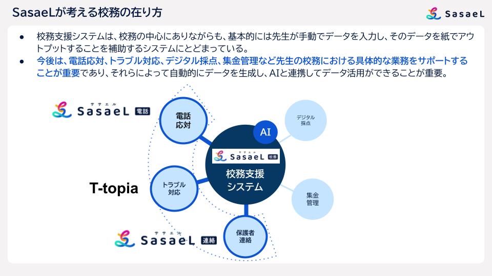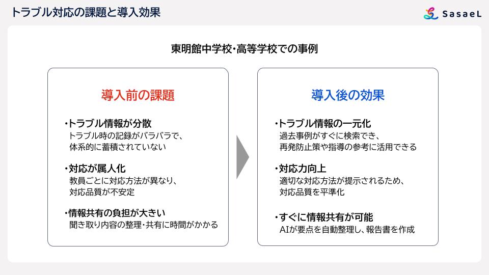 また、トラブル対応の「T-topia」では、対応時のリスクや留意事項、聞き取りの手順などを事前にイメージできることで、対応時の参考になる、特に対応経験の少ない若い教職員の役に立ったという声が上がっているという。報告書作成にかかっていた時間の大幅短縮にもつながっているとのことで、「そのぶん、先生方が子どもたちと向き合う時間を増やせているのではと感じています。企業でも進んでいる事務的な業務はAIに置き換えて本質的な業務に時間を割けるように、という動きを先生方にもお届けしていきたいですね。」と村中氏は語った。