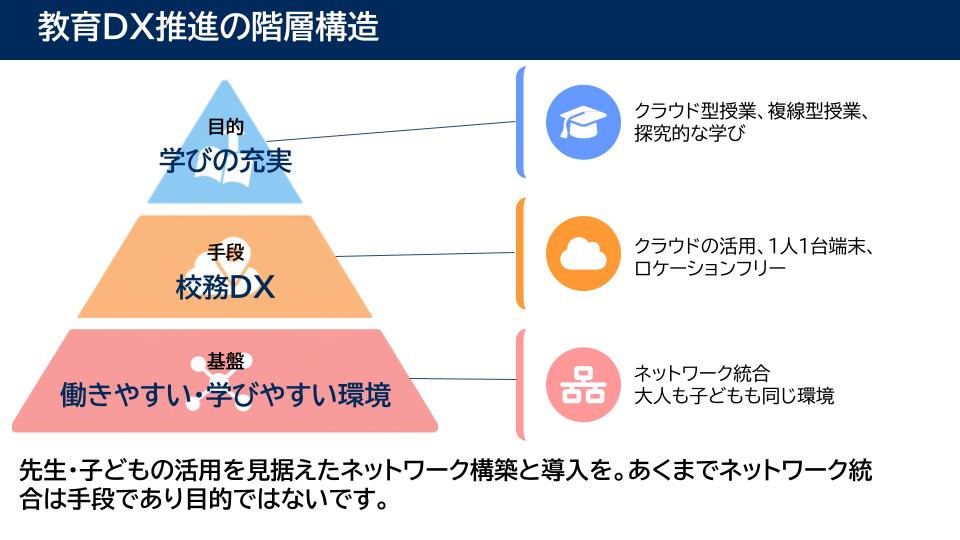 米田氏は、教育DXの推進を、目的としての「学びの充実」、その実現手段としての「校務DX」、そしてそれを支える基盤としての「働きやすい・学びやすい環境づくり」の三層構造で説明し、基盤となるシステム導入において、この三層構造の全体を意識し、最上段の目指す姿を描きながら取り組む必要があると語った。