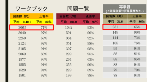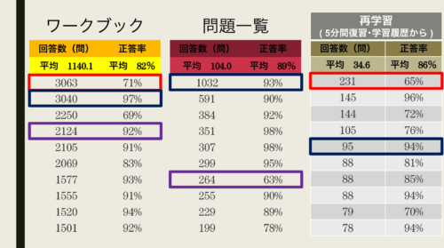 青い枠の生徒も問題数が3040問と、平均に比べると大変多いです。さらに、間違えやすい問題などをピックアップして問題一覧から解いており、自分で調整して学習に取り組んでいる様子が伺えます。