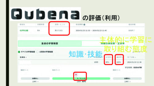 正答率を「知識・技能」、進捗率を「主体的に学習に取り組む態度」として評価に利用していますが、「思考・判断・表現」についても、配信するワークブックの問題によっては評価できると考えています。