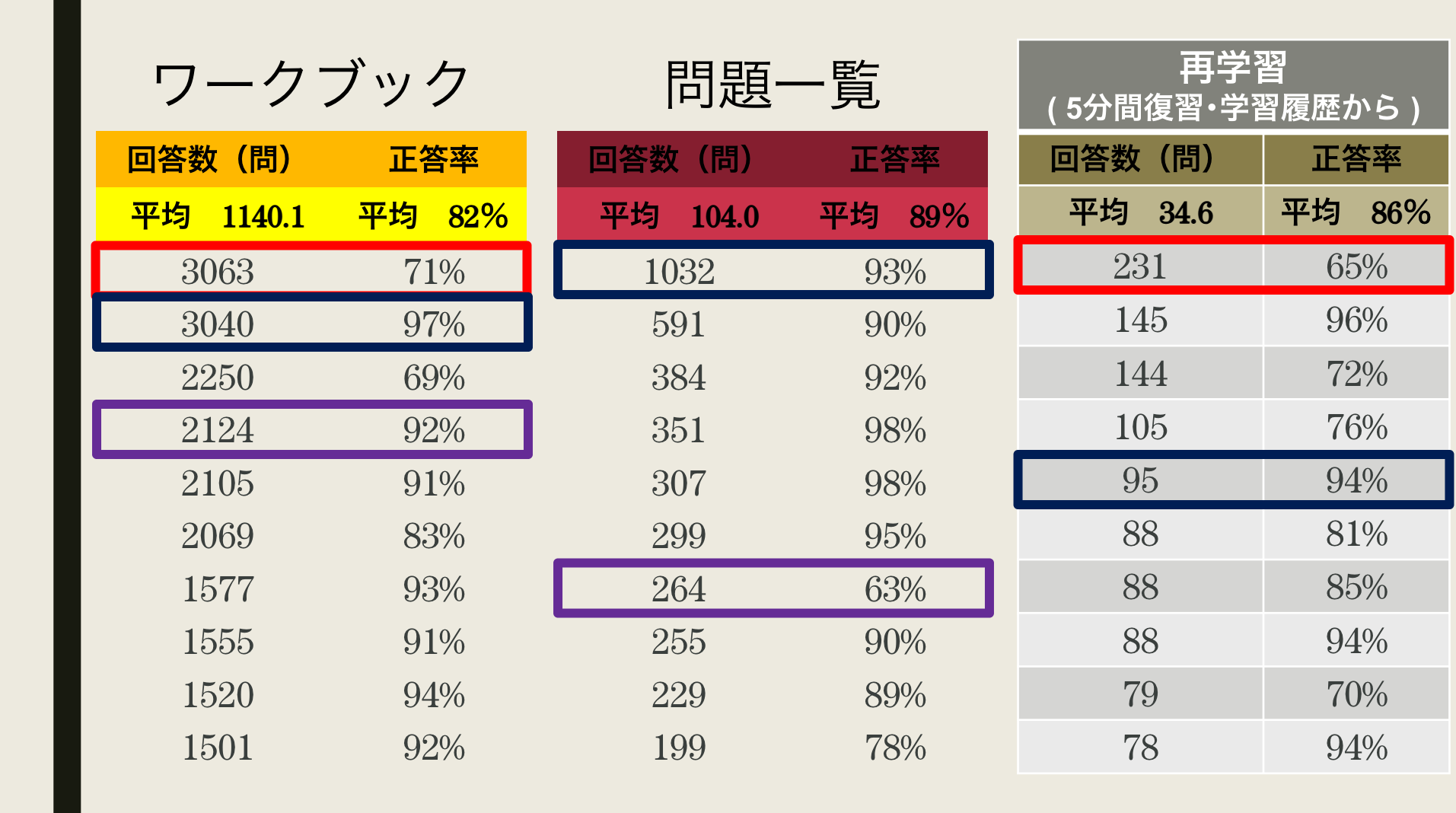 青い枠の生徒も問題数が3040問と、平均に比べると大変多いです。さらに、間違えやすい問題などをピックアップして問題一覧から解いており、自分で調整して学習に取り組んでいる様子が伺えます。