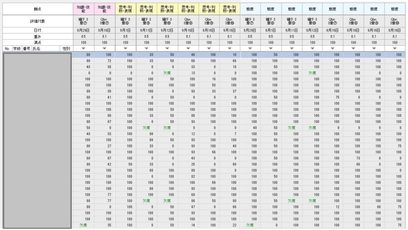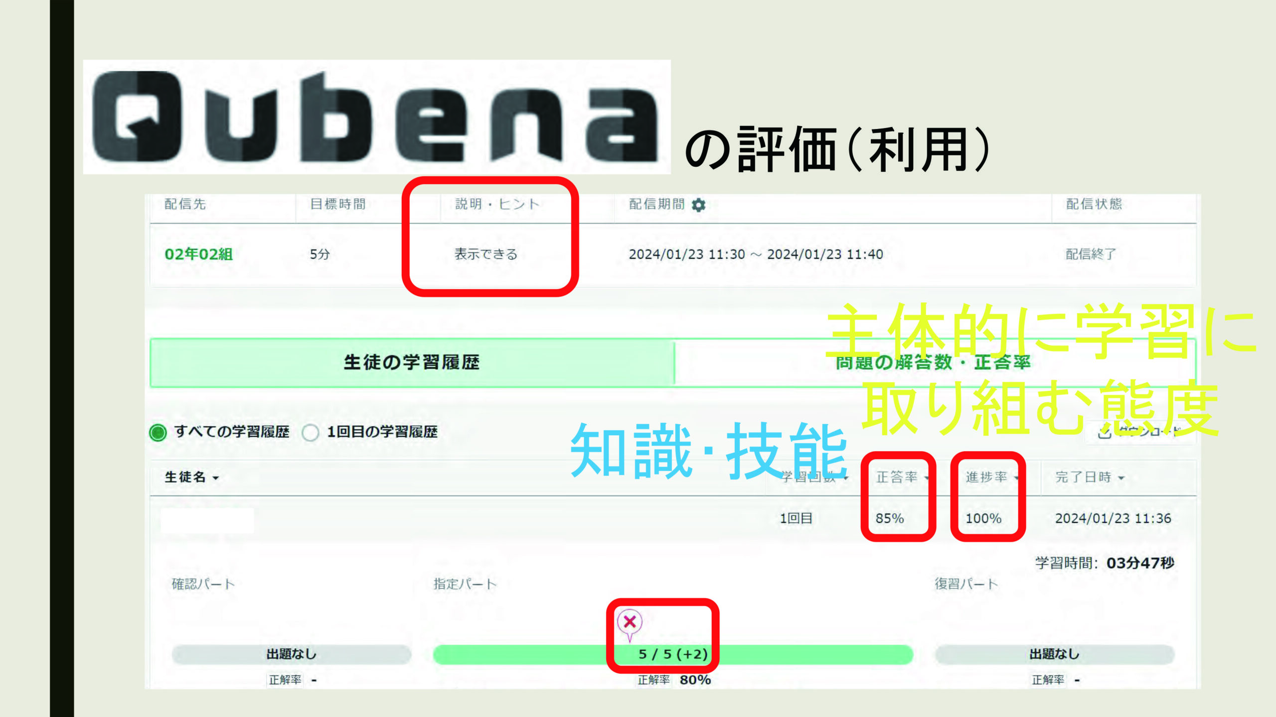 正答率を「知識・技能」、進捗率を「主体的に学習に取り組む態度」として評価に利用していますが、「思考・判断・表現」についても、配信するワークブックの問題によっては評価できると考えています。