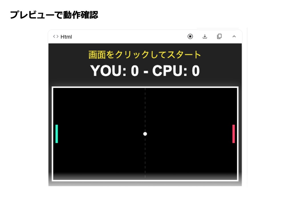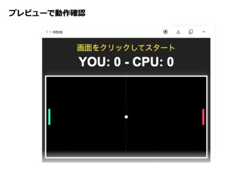 自分のパドルをマウスやタッチで上下に移動させ、相手のパドル(CPU)はボールの方へ自動で移動させます。