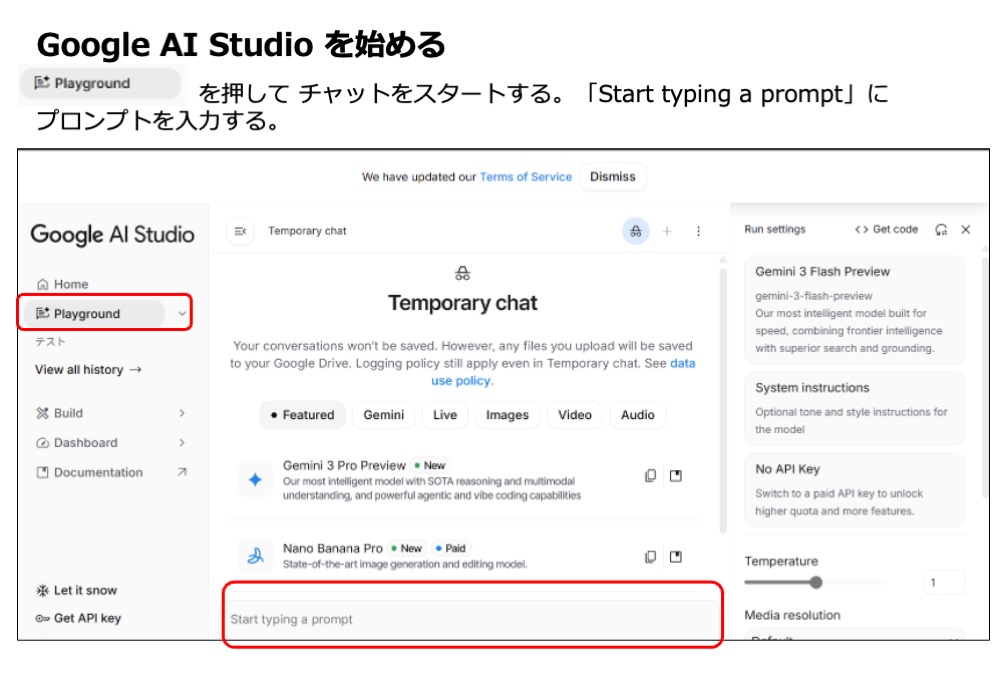 *「Playground」がない場合 「+Create new」 や 「Chat prompt」 を選んでください。もしお手元の画面が本記事の紹介と異なる場合は、画面内の「Help」「Documentation」を確認してください。