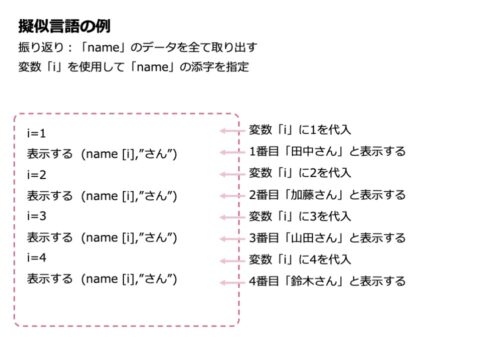 擬似言語では、「変数名 = (値)」で代入を行います。リストのデータを取り出す リスト名[添字] の添字部分に、Scratchと同様で i を用いて name[i] としています。
