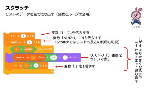 *Scratchでは「リストのながさ」ブロックで値数を取得できますが、擬似言語では、値数を変数(NINZU)に代入する傾向があるため今回の例では揃えています。